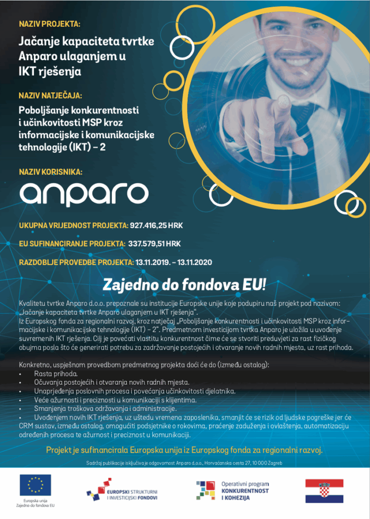 Projekt sufinancira Europska unija iz Europskih strukturnih i investicijskih fondova u financijskom razdoblju 2014 – 2020, konkretno, iz Europskog fonda za regionalni razvoj, kroz natječaj „Poboljšanje konkurentnosti i učinkovitosti MSP kroz informacijske i komunikacijske tehnologije (IKT) – 2“. Predmetnom investicijom tvrtka Anparo je uložila u uvođenje suvremenih IKT rješenja.